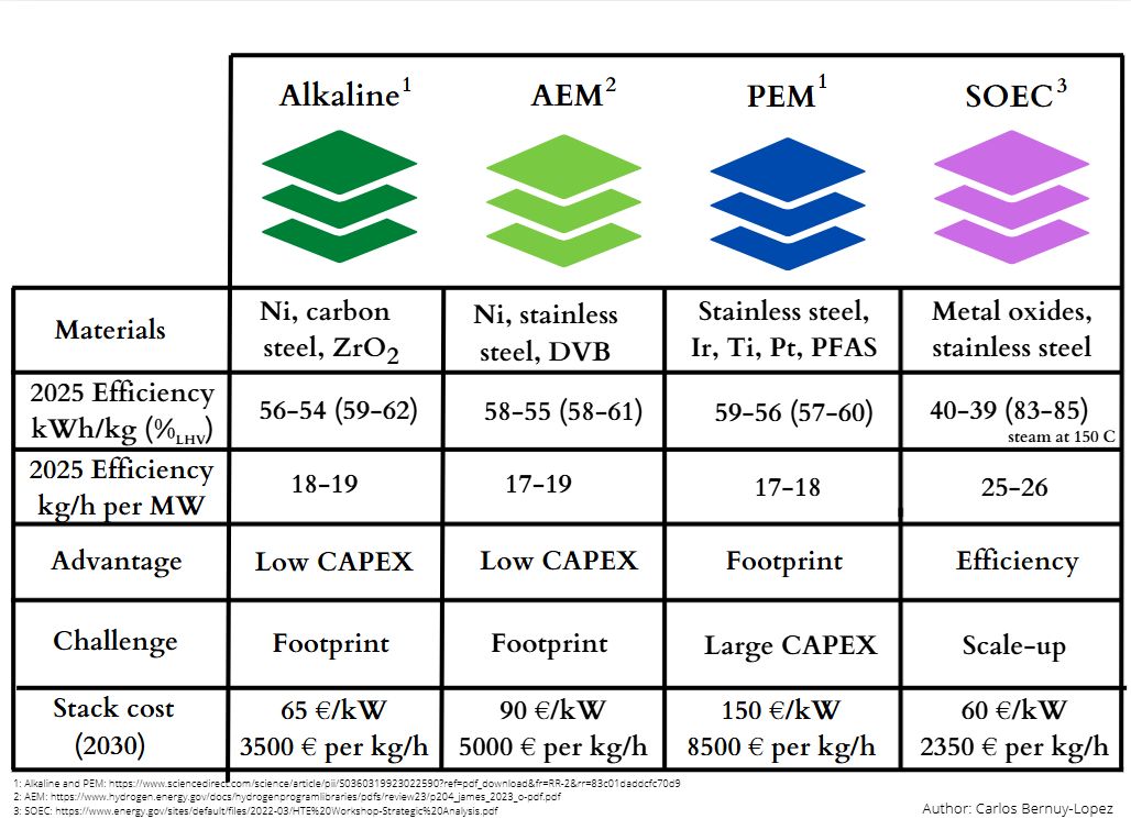 This chart (shared by Carlos Bernuy-Lopez 👏) does a great job at putting today’s main electrolysis technologies side by side.
